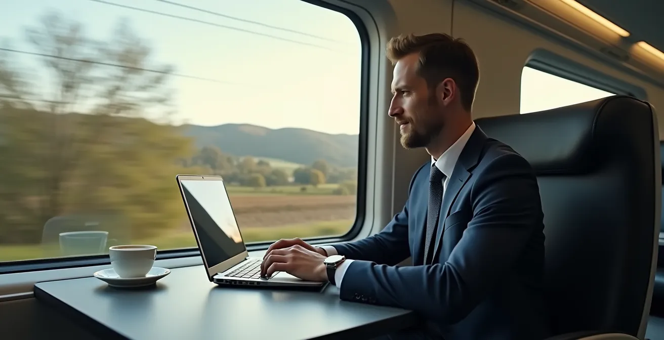Au-delà de l’impact carbone, un argument majeur en faveur du train réside dans la notion de productivité effective. Le temps de transport n’est plus une parenthèse « perdue » mais se transforme en une extension du bureau. Un trajet en train offre des conditions de travail souvent bien supérieures à celles d’un voyage en avion, où le temps réellement productif est fragmenté et limité. Pensez-y : un voyageur d’affaires peut ouvrir son ordinateur portable et commencer à travailler dès son installation dans le train, et ce, jusqu’à son arrivée en gare.